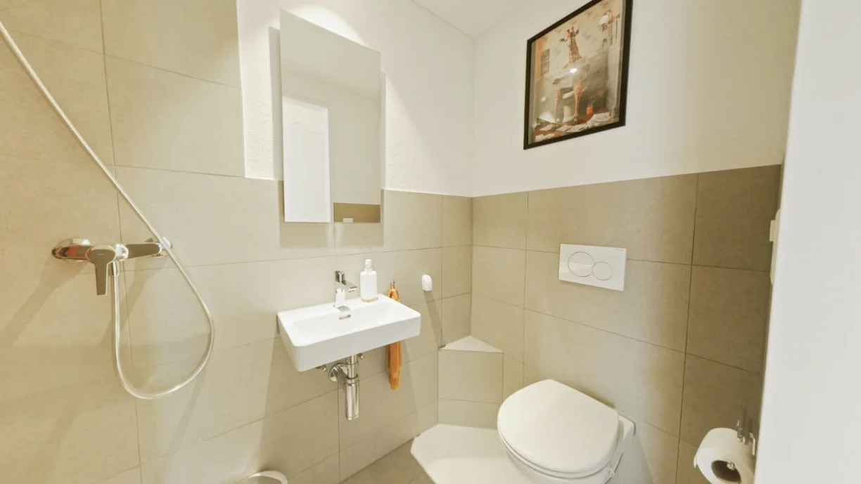 Ein separates WC mit Dusche, ein Einbauschrank im Entrée sowie ein Reduit mit eigener Waschmaschine, Tumbler und Lavabo bieten viel Stauraum und machen den Alltag besonders angenehm.