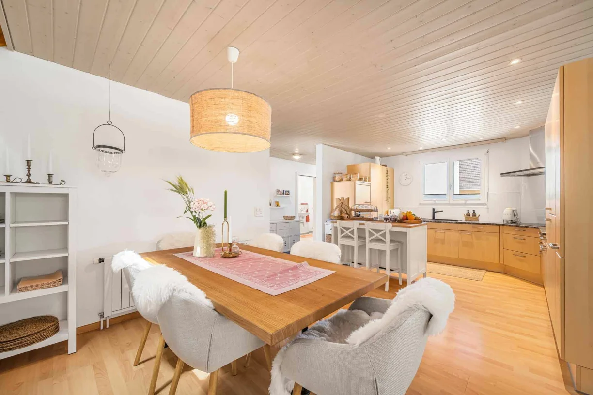 Der durchgängige Buchenparkett verleiht dem Wohnbereich Wärme und Wohnlichkeit. Küche und Nasszellen sind gepflegt und zeitgemäss.