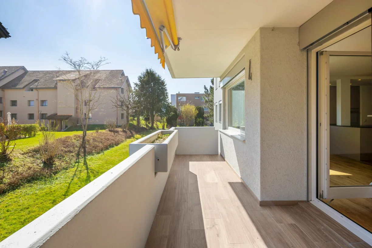 Bereits beim Eintreten fällt der praktische Eingangsbereich mit Einbauschränken auf, der viel Stauraum bietet und für Ordnung sorgt. Das Herzstück der Wohnung bildet der grosszügige Wohn- und Essbereich mit offener Küche. Die hochwertige Küche aus einer Schweizer Manufaktur überzeugt mit modernen Geräten und einer grosszügigen Arbeitsfläche und fügt sich harmonisch in den lichtdurchfluteten Wohnraum ein. Von hier aus gelangen Sie direkt auf den rund 10 m² grossen Balkon, der zum Verweilen und Entspannen einlädt.